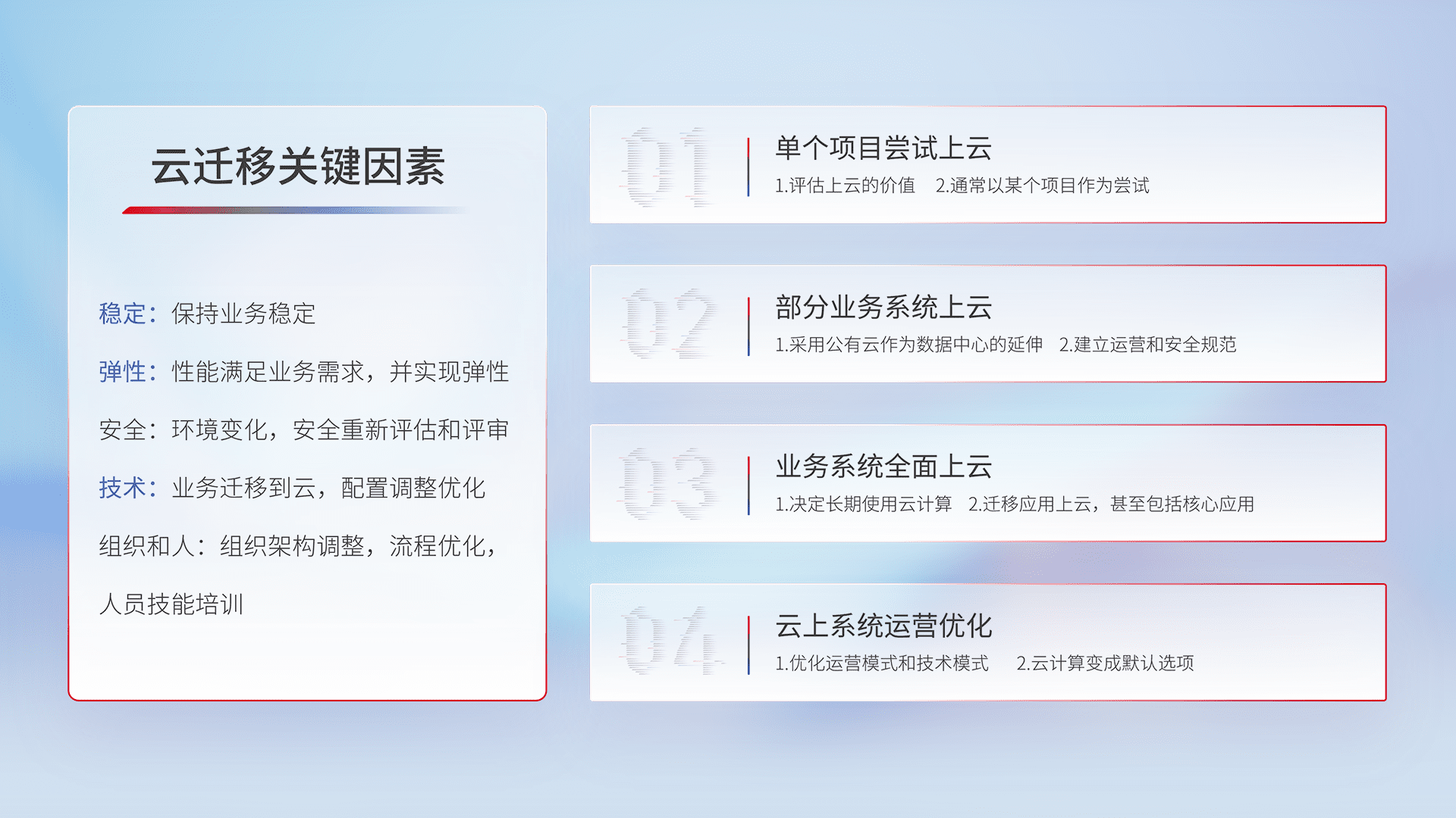 结合实际业务,,,从规划设计、、、、云平台选型、、、云原生改造、、、、数据迁移、、、集成交付,,迁移全过程为客户识别最佳上云路径,,,做好风险识别管理,,,设计网络架构、、身份权限、、、、安全审计合规、、操作审计、、、日志审计、、、、监控告警策略、、、多站点容灾设计等,,,对云上基础设施进行整体规划,,提升IT治理水平,,,,以满足弹性、、高可用、、、、高性能的需求。。