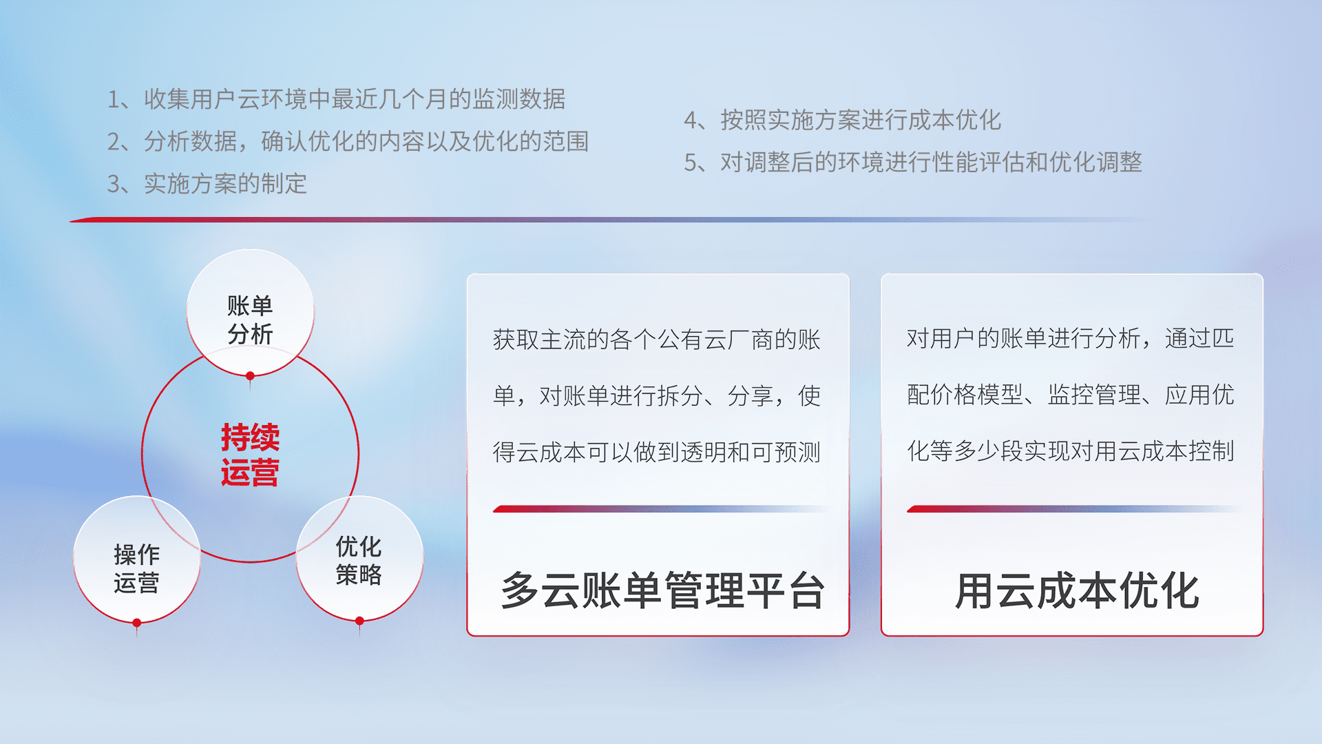 通过多云纳管,,,以统一的资源数据模型把客户的云资源进行抽象和封装,,,进而实现对多云资源的统一操作,,保障云资源管理的可靠性、、、稳定性与可用性。。。。量身定制化运维内容,,,配置、、、开发运维、、补丁管理、、、备份、、、监控、、认证和访问管理、、审计和日常巡检等,,,保障在用云过程中的可靠度,,,,稳定度以及高可用率。。。