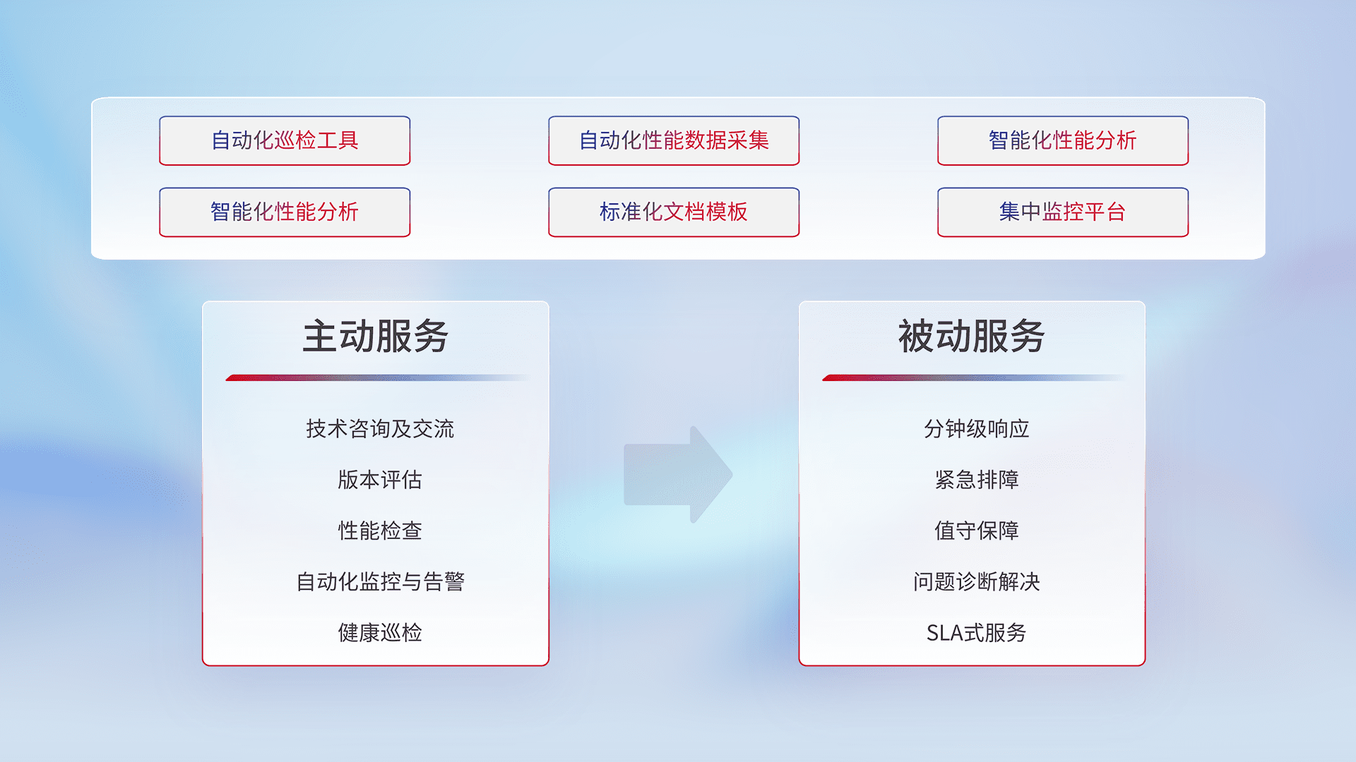 智能化工具和标准化文档,,,保障服务质量,,提供主动服务(包含技术咨询、、版本评估、、、性能检查、、自动化监控与告警、、、健康巡检)和被动服务包含(分钟级响应、、紧急排障、、、值守保障、、、问题诊断解决、、、、SLA服务)。。